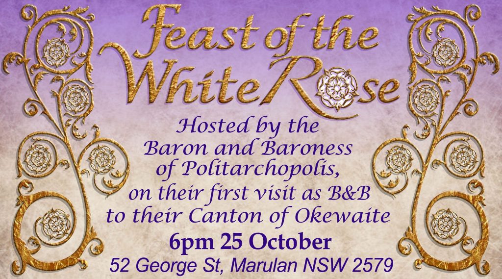 The Feast of the White Rose has a plausible menu of that time, based on surviving recipes. In these modern middle ages, it is hosted by the Baron and Baroness of Politarchopolis, visiting their canton of Okewaite. Please join them for an evening of fine fare and medieval pursuits.