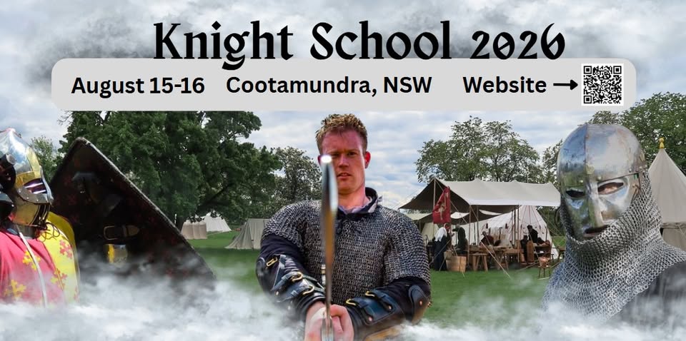 Text: Knight School 2026. August 15-16. Cootamundra, NSW. Website https://tlampasona.wixsite.com/knight-school-lochac